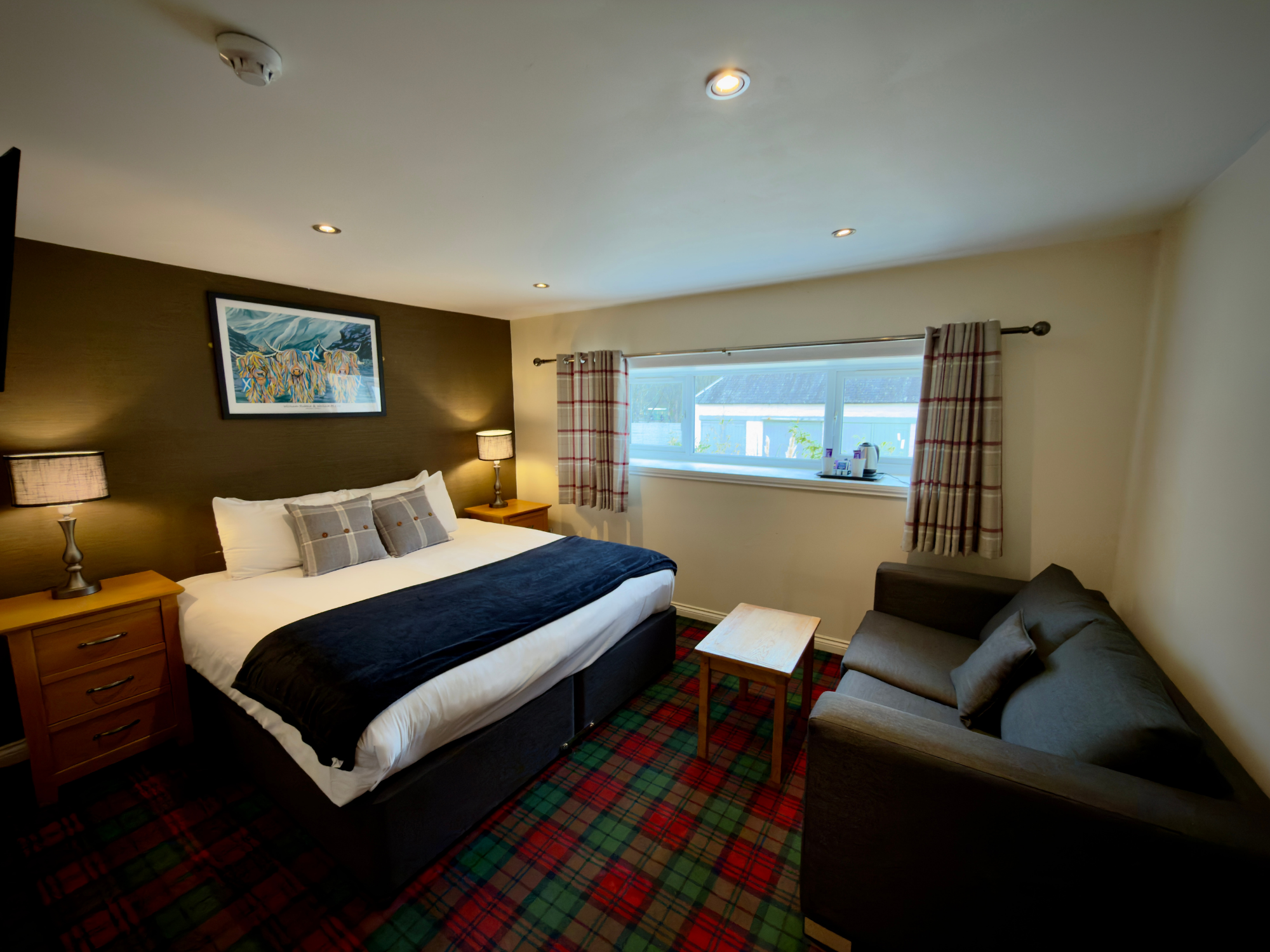 Our Executive King Rooms offer extra space and comfort, perfect for guests looking for a more luxurious stay at Killin Hotel. Each room features a spacious king-size bed, stylish furnishings, and comfortable seating with chairs and a table, creating a relaxing space to unwind.